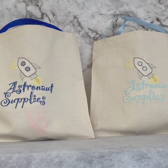 Unbleached cotton party bags embroidered to order with a rocket and the words "Astronaut Supplies". Seen here in Light Blue and Dark Blue.